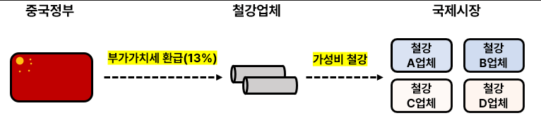 - 기존 : 중국 자국내 수출 업체(특히, 철강)들이 내야할 '부가가치세(일명, 증치세)'를 수출 할 때는 면제 해줌(보통 13%). 세금을 내지 않아도 되는 수출업체들은 국제시장에서 가격경쟁력을 확보할 수 있었음.