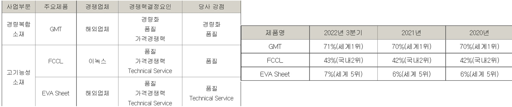 · 가공소재 : GMT(경량플라스틱, 전기차소재로 쓰임), FCCL(FPCB 중간과정)