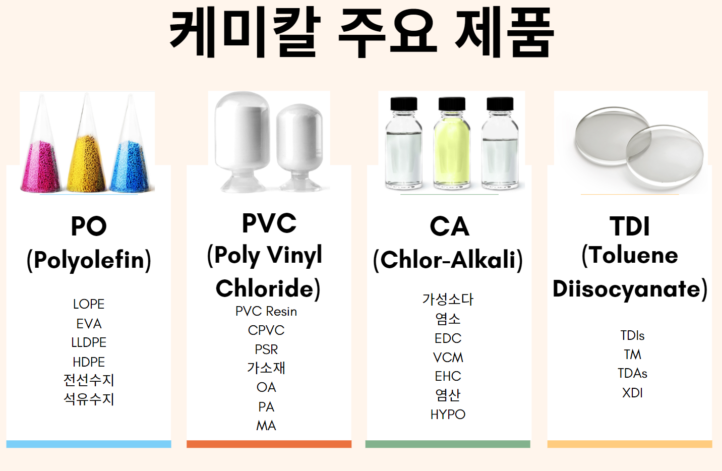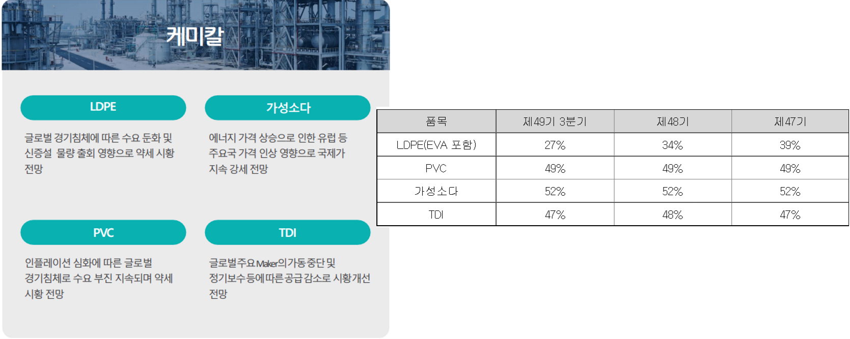 · 석유화학 : LDPE, PVC, 가성소다(염소계, 표백제로 주로 쓰임)
