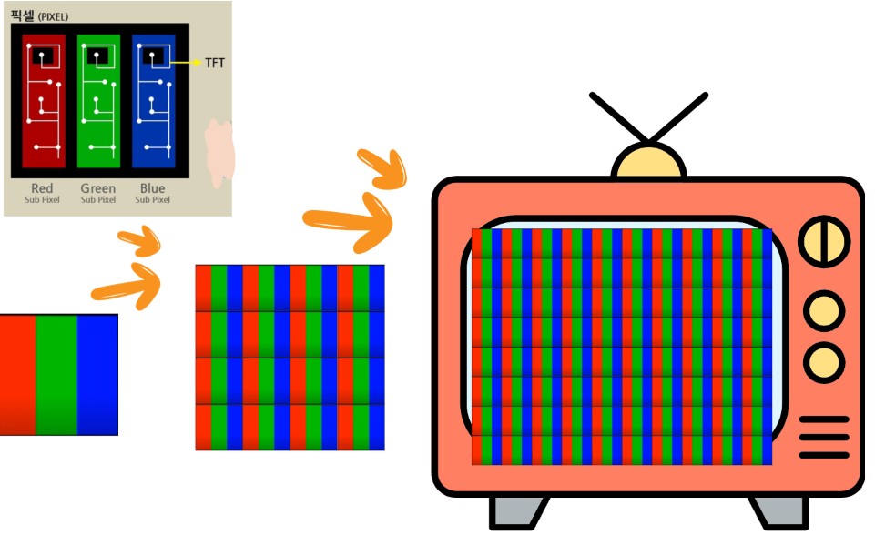 하지만 액정은 빛을 유도하는 역할만 있다고 했죠? 밝고 어둡게는 가능한데 그럼 색은 어떻게 내느냐? 그 역할을 컬러필터(Color Filter)가 합니다. 백라이트-편광판-액정-편광판 을 통과해서 나온 빛을 '컬러필터'에 통과시키면서 우리눈에 비추는 굉장히 많은 색상의 빛이 나오는데요. 기본적으로 빨간색(Red), 녹색(Green), 파란색(Blue), 빛의 3원색으로 이루어져 있으며 이 3가지 색의 컬러필터가 각각의 픽셀에 배치가되요, R,G,B와 액정을 통과하는 빛의 밝기(0~100까지의 밝기)로도 많은 색상을 낼수 있지만 수백만의 다양한 색을 표현하기는 조금 모자라죠? 그래서 액정처럼 R,G,B를 구성하는 각 픽셀의 밝기를 조절해주는 TFT(Thin Film Transistor) 즉, 반도체로 이루어진 전자회로로 전류의 흐름을 조절하는 '박막트랜지스터'로 R,G,B의 색을 조절하여 수백만의 다양한 색을 표현 할 수 있는 LCD가 작동하는 거랍니다!