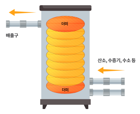 습식산화, 건식산화, 라디칼산화를 배웠으면 어떻게 실제로 반도체공정에 쓰이는지 알아야겠죠. 아래 그림은 정말 간단히 표현한 그림인데요. 그림을 보면 알 수 있듯, 산화공정장비안에 웨이퍼들이 여러개 들어가 있어요. 산화막 생성작업은 웨이퍼 하나씩 하는 것이 아니라 여러개를 한 번에 하기 때문에 상당히 빠른편에 속합니다.