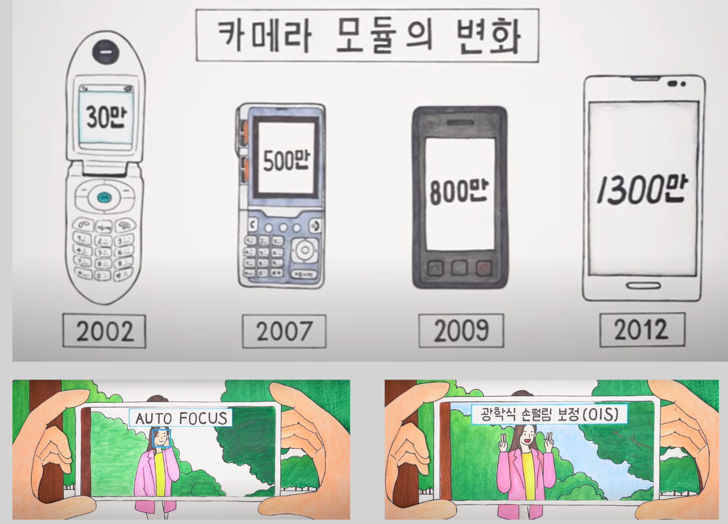 스마트폰 뒤에 보이는 자그마한 카메라보이죠? 정말 작고 좁은 공간에 맞춰서 여러 렌즈와, 이미지 센서, 포커싱 장치들을 설계하고 조립해야하기 때문에.. 과거에는 전문 카메라와 비교했을때 화소, 화질, 화각 등 여러가지 부분에 있어서 아주 많이 차이가 났었죠. 초기 모바일 기기인 2002년으로 거슬러 올라가면 렌즈 하나로 구성된 싱글 카메라가 탑재되었어요(지금처럼 여러 제품들이 결합한게 아님) 약 30만화소였죠.. 카메라의 기능이 없다고 생각할 정도로 처참했었어요. 상상도 못하겠죠? 그래서 화소수 향상을 위한 연구와 개발이 꾸준히 이루어졌고, 2007년에는 500만화소, 2009년 800만화소, 2012년 1300만화소까지 빠르게 성장했어요, 또한 이미지 품질을 더 높이기 위해 피사체에 초점이 자동으로 맞춰지도록 하는 오토포커스(Auto Focus) 기능과 카메라의 움직임에 따라 렌즈가 사람 눈처럼 미세하게 움직여 초점을 맞춰 깨끗한 사진을 얻을 수 있도록 하는 광학식 손떨림 보정(OIS)기능을 탑재해 사용자가 보다 선명한 사진과 영상을 얻을 수 있도록 했어요.