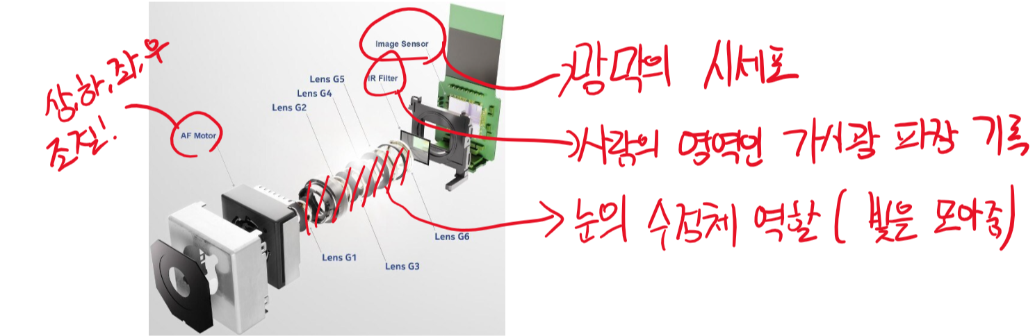 카메라 모듈은 크게 사람의 눈으로 치면 망막의 시세포에 해당하는 이미지센서(Image Sensor)와(주요 기업 삼성LSI, Sony, 옴니비전, SK하이닉스 등) 눈의 수정체 역할을해 빛을 모아 이미지 센서면에 상이 맺혀지게 하는 렌즈 모듈(Lens Module)이(주요업체 Largan, Sunny, 세코닉스 등) 있으며, 엑츄레이터(Actuator)는 렌즈 모듈과 결합되어 이미지 센서면에 최적의 초점을 맺을 수 있도록 상,하,좌,우,앞,뒤로 움직여주는 역할(주요업체 삼성전기, 미네비아미쯔미, 알프스)을 IRCF(IR Cut Filter)는 사람이 눈으로 보는 영역인 가시광 파장을 기록하는 역할을 해요.