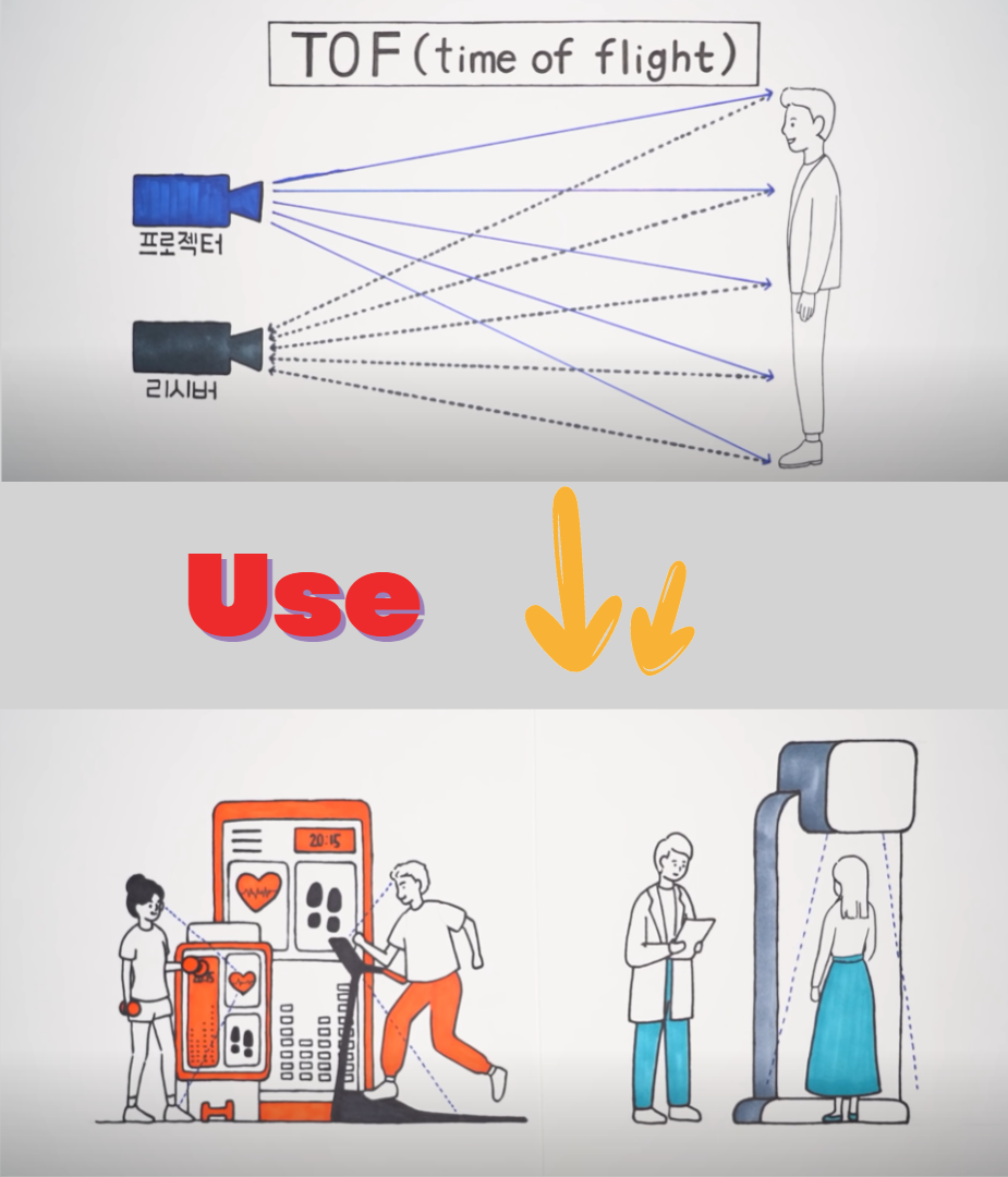 또한 LG이노텍은 TOF기술(Time Of Flight)을 보유하고 있는데요 TOF모듈은 피사체를 향해 발사한 빛이 반사되어 돌아오는 시간으로 거리를 계산해 공간을 입체감있게 인식할 수 있게 해주고 피사체의 움직임을 파악할 수 있게 하는 부품이에요. 이 제품을 스마트폰이나 웨어러블 기기 등에 장착하면 운동 동작, 움직임의 세밀한 측정이 가능하고 헬스케어분야에서는 환자의 자세 및 체형 측정등에 사용할 수 있어 여러분야에 적용 되고 있어요~