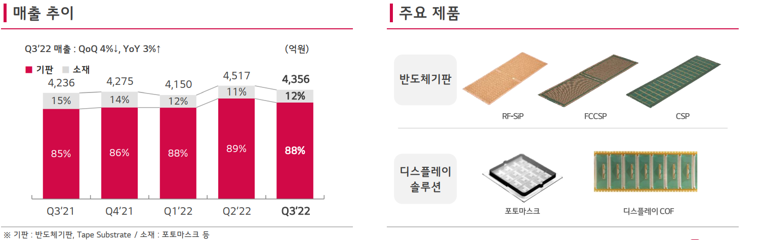 카메라 모듈보다 영업이익률이 높고 시장 성장세도 높아지는 반도체 기판에 대해서 혹시 아시나요?(자세한 설명은 삼성전기 분석[참고]) 반도체기판은 전자기기의 여러 기능들이 잘 구현될 수 있도록 전기적으로 연결해주는 우리 인체의 신경망 역할을 하는 친구들이에요~ 최근 LG이노텍은 FC-BGA 사업 진출을 공식화하며 연구에 힘쓰고 있는데요! 특정 분야에서는 삼성전기보다 앞선 점유율을 가지고 있답니다! 주요 제품으로는 최근 진출한 FC-BGA(Flip chip Ball Grid Array)로 중앙처리장치(CPU), 그래픽처리장치(GPU) 등 반도체 패키지에 주로 쓰이는 고사양 제품으로 인공지능(AI), 자동차, 서버, 네트워크 등 다양한 분야에서 수요가 급증하고 있어요(애플카와 관련 기판). 또한 2018년에 뛰어든 안테나 모듈(AIP)용 기판 사업도 글로벌 5G안테나 모듈용 기판 시장에서 51%의 점유율(글로벌 1위)을 가지고 있구요, 통신 반도체용 부품인 RF-SiP와 Aip 기판, 디스플레이의 핵심소재인 Tape Substrate와 Photomask 분야도 글로벌 1위 기업이랍니다!