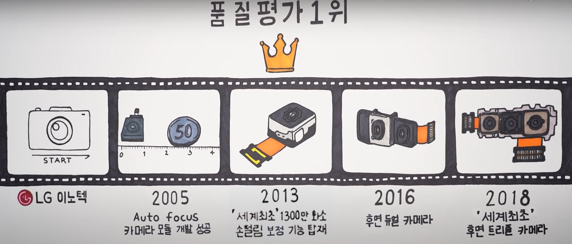 그 역사를 살펴보면 모바일 카메라의 중요성을 인지한 LG이노텍은 2005년 50원짜리 동전크기의 세계최소형 200만 화소의 오토포커스 기능을 갖춘 카메라 모듈 개발에 성공하였고, 2013년에는 세계최초로 1300만 화소에 손떨림 보정 기능(OIS)을 탑재한 카메라 모듈을 개발해 프리미엄폰 카메라들을 제치고 글로벌 평가업체인 폰아레나로부터 품질평가 1위로 선정되었습니다. 이후 세계최초 후면 듀얼 카메라 2016년, 세계최초 후면 트리플 카메라 2018년을 구축해 냈죠.(주요 고객사는 애플! 아이폰에 들어가는 카메라의 진실)