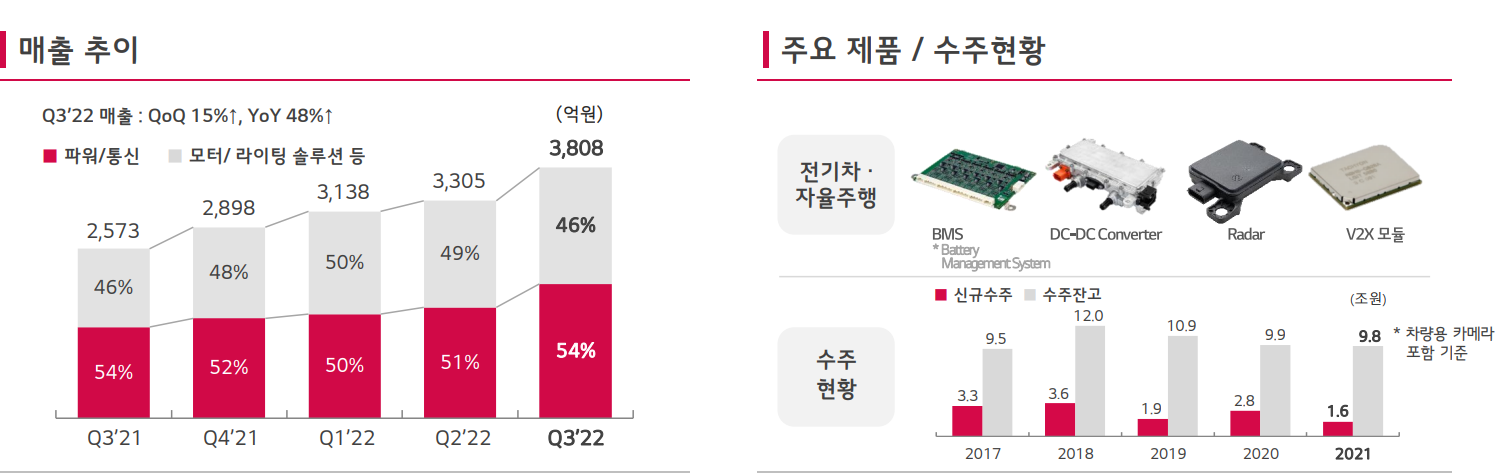 LG이노텍은 전장부품도 생산하고있어요! 제조하는 전장부품은 차량용 카메라, 라이다(LiDAR) 등의 센싱 솔루션과 5G, V2X등의 통신솔루션을 기반으로 해서 제품들을 만들고 있는데요. 느낌이 오지 않아요?? 바로 카메라 모듈과, 반도체 기판에서 만들 수 있는 제품들을 차량화 시킨것들의 전장부품들이에요!(삼성전기도 전장이득봤어요) 광학솔루션의 1인자답게 영상시인성 관점에서 최고의 인식률을 구현! 전기차량의 경우 데이터를 통한 제품간 호환성 증대에 초점을 맞추고 LTE, 5G등 통신세댸별 회로 설계를 지향하는데 글로벌 5G안테나 모듈 기판에서도 높은 점유율로 1위자리를 유지하고 있죠.