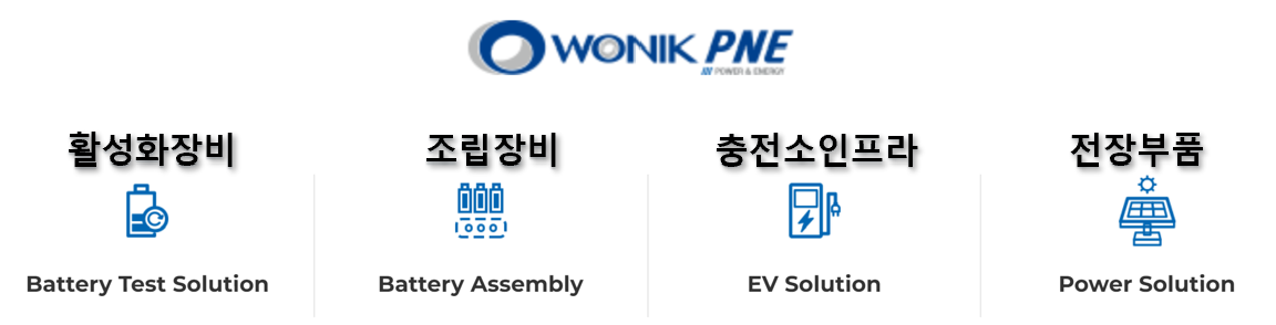 원익피앤이는 이차전지공정인 조립공정, 활성화공정 장비를 주력으로 생산하는 업체입니다. 조립공정은 각형, 파우치형을 조립할 수 있는 장비를 보유하고 있어요.