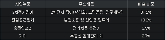 조립&활성화장비(81%, 조립=각형,파우치/활성=원통형,각형,파우치), 전원공급장치(10%, 전압유지, 가스터빈기동장치), 전기차충전기(6%), 기타(3%)