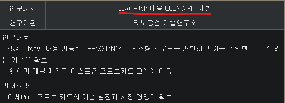 그리고, 점차 미세화 되어가는 반도체소자들 트랜드에 맞게 리노핀도 55마이크로미터의 피치를 대응하기 위해 초소형 프로브를 만들고 있다고 공시하고 있습니다. 현재 75마이크로미터까지 양산화되었고 55마이크로까지 한다고하니 점점 초소형화가 되어가고 있습니다.