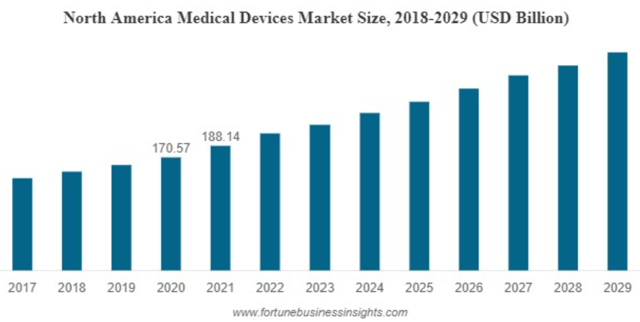 의료시장 규모가 가장 큰 북미지역에서 얼마나 의료기기가 성장 할 것인지를 예측한 표가 있는데요. 앞으로 연평균 5.5%의 성장률을 의료기기시장은 2029년까지 꾸준히 이어갈 것으로 예측하고 있습니다.