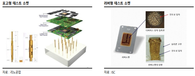테스트 소켓은 포고(Pogo)형과 러버(Rubber)형으로 나뉘는데요. 포고형은 스프링기반의 핀 타입으로 30년 이상 쓰여온 전통적인 방식이에요. 접촉률이 높아 정확도가 우수하며, 미세화, 수명에 강점이있어요. 주로 비메모리에서 많이 사용이 됩니다. 러버형은 고무(러버, Rubber) 안에 전도성 알갱이(구리 or 니켈)을 넣어서 테스트해보는 볼 타입의 방식이에요. 긴 기둥보다는 볼이 더 짧아서 신호가 빠르죠. 그래서, 포고형 보다 속도가 더 빠른데요. 아직은 메모리 반도체 테스트에서 많이 사용이 되지만, 점차 비메모리까지 러버형 소켓이 사용될 것으로 여겨지고 있어요.