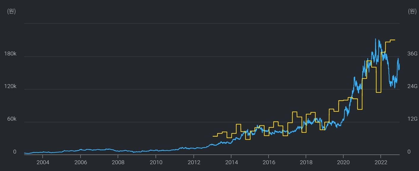 증가하는 매출액과 영업이익률 : 영업이익률이 최근 3년 평균 39.38% 압도적으로 높다. 현재는 40% 이상 뚫는 중