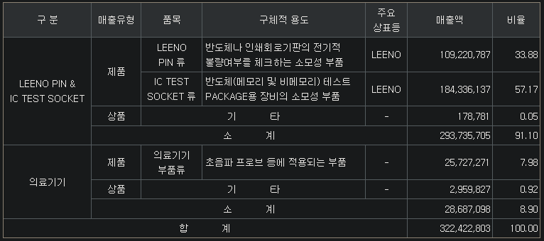 · Leeno Pin(상품, 이차전지핀 포함) : 반도체, 인쇄회로기판 전기적 불량여부 체크용 소모성부품 -> 다품종 소량생산, IT부품 점차 미세화 / 이차전지 검사부품 / 수출 72.5%, 내수 27.5%