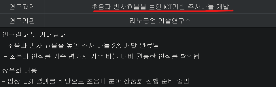 연구실적으로 보는 리노공업의 현주소 : 테스트핀 고온 저항 + 미세화 / 의료기기 초음파 + 인식 잘되는 주사바늘