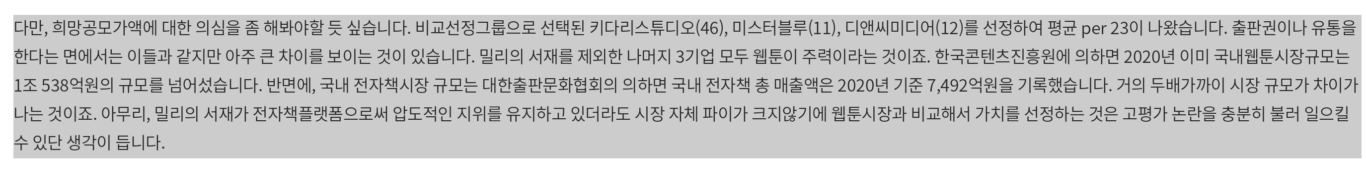 다만, 희망공모가액에 대한 의심을 좀 해봐야할 듯 싶습니다. 비교선정그룹으로 선택된 키다리스튜디오(46), 미스터블루(11), 디앤씨미디어(12)를 선정하여 평균 per 23이 나왔습니다. 출판권이나 유통을 한다는 면에서는 이들과 같지만 아주 큰 차이를 보이는 것이 있습니다. 밀리의 서재를 제외한 나머지 3기업 모두 웹툰이 주력이라는 것이죠. 한국콘텐츠진흥원에 의하면 2020년 이미 국내웹툰시장규모는 1조 538억원의 규모를 넘어섰습니다. 반면에, 국내 전자책시장 규모는 대한출판문화협회의 의하면 국내 전자책 총 매출액은 2020년 기준 7,492억원을 기록했습니다. 거의 두배가까이 시장 규모가 차이가 나는 것이죠. 아무리, 밀리의 서재가 전자책플랫폼으로써 압도적인 지위를 유지하고 있더라도 시장 자체 파이가 크지않기에 웹툰시장과 비교해서 가치를 선정하는 것은 고평가 논란을 충분히 불러 일으킬 수 있단 생각이 듭니다.
