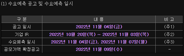 - 기관투자자 청약일 : 22.11.10 ~ 11.11일 (2일간) / 시간 : 10:00 ~16:00 / 납입기일 : 증거금 50%를 11.15일까지 지불.