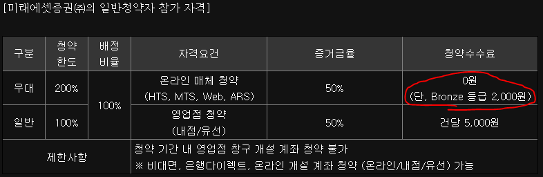 주관사 미래에셋증권을 통해 청약을 하려면 대부분의 분들이 온라인을 통하고 일반고객이라고 한다면, 수수료 2,000원의 비용이 들어갑니다.