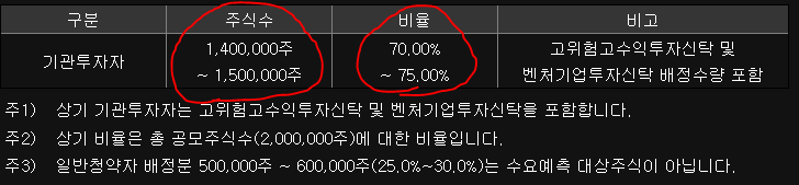 총 2백만주가 배정되어있는 것을 볼 수 있어요. 여기서 일반투자자랑 기관투자자의 비율도 나눠지겠고 구주매출이 들어간다면 더 자세한 배정수량을 볼 수 있습니다.