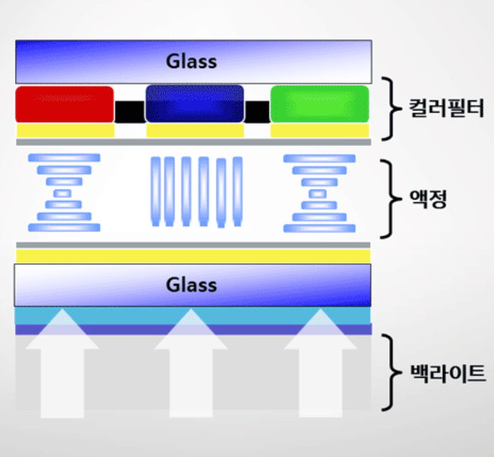 우선, LCD(Liquid Crystal Display)는 Display '내보이는' Liquid Crystal '액정' 뜻 그대로 하면 '액정으로 내보이는 장치'라고 생각하면 쉽습니다. 여기서 '액정(Liquid Crystal)'에서 나온 문장들이 "액정이 깨졌다", "액정을 교체해야한다"란 말들이에요. 그래서 착각하는게 액정=디스플레이 장치 로 오해하시는 분들이 많죠. 사실 '액정(Liquid Crystal)'은 액체와 고체의 성질을 함께 가지는 액체결정 물질로 빛의 방향을 조절할 수 있게 해주는 물질이에요. 액정 자체는 스스로 빛을 내거나 색을 입혀주지 않기에 패널 뒷면에 백색의 빛을 비추는 백라이트(Back Light)와 색을 내주는 컬러필터(Color Filter)를 함께 사용하는데 이게 LCD의 기본 구조랍니다.