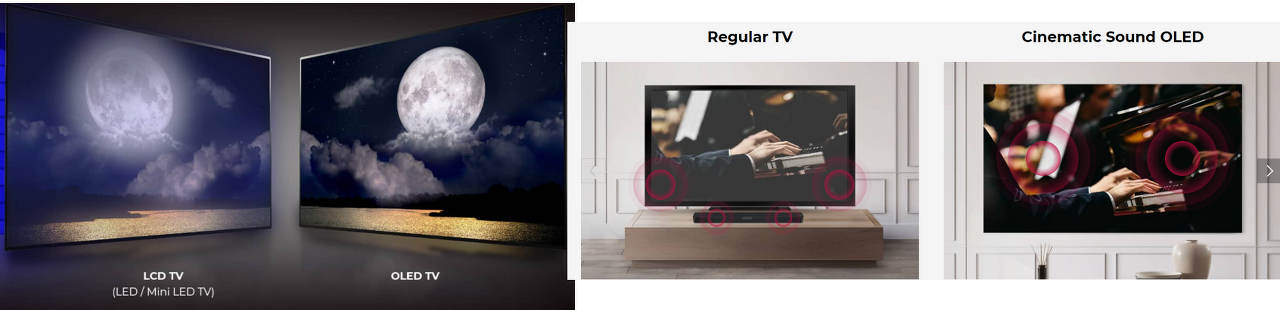 OLED란 Organic Light Emitting Diode의 약자에요. 그대로 풀어보면 '유기발광다이오'란 뜻이죠. OLED를 이해하기 위해서는 LED(Light Emitting Diode)를 알아야해요.. 어려워하지 마세요~ LED는 LCD와 방식은 똑같으나 뒤의 백라이트가 없다는 것이 큰 차이점입니다. 그럼 어떻게 빛을 내느냐고요? 바로 스스로 낼 수 있다는 겁니다! 그래서 LCD제품보다 더 얇게, 저 선명하게, 더 오래 사용할 수 있다는 장점이 있는 제품이에요. 여기서 OLED는 '유기화합물(Orhanic)'으로 이루어진 LED디스플레이를 말합니다. 자 'LCD'에서 백라이트를 자체발광(LED)으로 바꾼게 'LED'. LED에서 더 나가 컬러필터도 없앤게 'OLED(Organic Light Emitting Diode)'입니다. 이 OLED는 형광 유기물질 자체에서 빛을 내며 각 소자 자체에 RGB색이 있어 백라이트, 액정, 컬러필터 등이 필요없어요! 그래서 더 가볍고 슬림하며 또한 휘어지게도 만들 수 있을정도로 유연하여 디자인이나 공간적 측면, 또한 각각의 소자가 제어되기에 색표현력, 대비, 명암비 등 화질적인 측면에서 우월하다고 볼 수 있어요 (예전에는 대형화가 불가능하다고 했으나 지금은..77인치..) 다만 유기물이 가열에 비교적 약해 번짐(잔상) 현상이 일어날 수 있다는점. 그리고 매우 비싸다는 단점..?