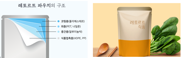 레트로트 파우치는 요즘 가정간편식(HMR) 포장에 쓰이는 포장지입니다. 대표적으로 찌개류 같은 것들이 포장이 많이 되어있죠. 여기에 알루미늄박이 들어갑니다. 외부 공기, 습기와의 차단을 해줘야하니깐요. 이것을 레토르트 파우치라고 해요.