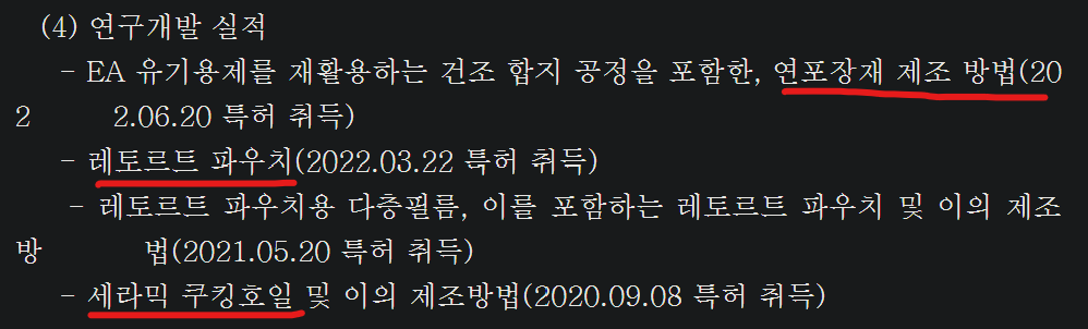 삼아알미늄이 특허를 획득한 것들을 보면, 의외로 식품쪽에 많다는 것을 알 수가 있어요. 연포장재는 삼아알미늄의 가공사업에 속하는데요. 알루미늄이 가공하기가 유연하기 때문에 여러가지 제품을 만들 수 있다고 설명했었죠. 그래서, 알루미늄이 필요한 제품에는 유연하게 대처가 가능한 것이죠. 연구개발 실적을 보면, 연포장재, 레트로트 파우치, 세라믹 쿠킹호일등이 있어요.