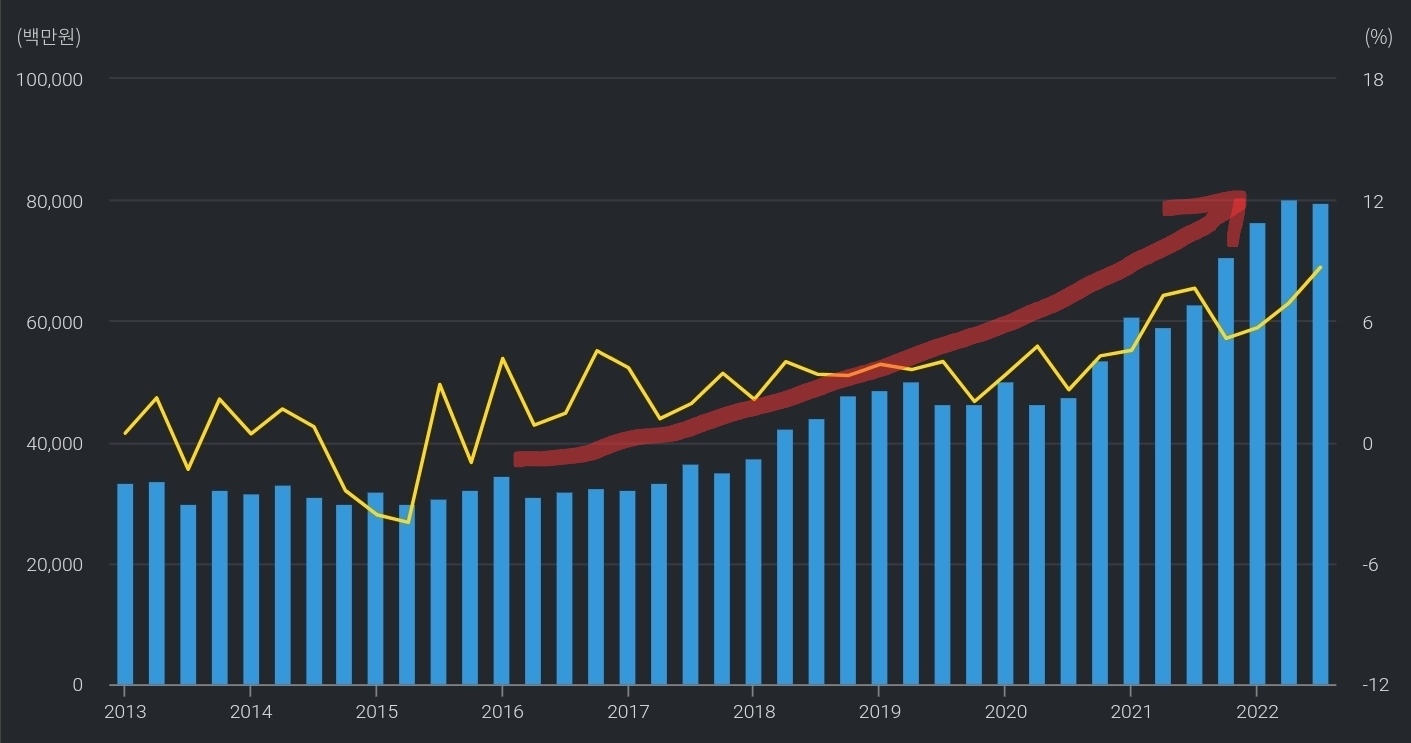 매출액, 영업이익률 모두 우상향 : 영업이익률 역사상 8% 이상 처음 돌파하여 앞으로 기대