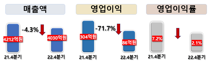 우선,22.4분기 매출액, 영업이익, 영업이익률은 작년 21.4분기 대비해서 전체적으로 떨어질 것으로 예상되요. 특히, 영업이익이 상당히 많이 떨어질 것으로 추측됩니다.