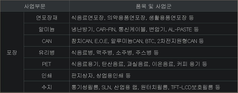 연포장-PET-유리병(51%), 제관(33%, 참치캔), 알미늄(8%, 압연 for 호일, 자동차, 전자제품), 수지&인쇄(5%, 합성수지, 종이포장재인쇄), 배터리부품(3%) / R&D : 원통형 캔(21파이, 46파이), 파우치셀(알루미늄 양극박) / 거래처 : 동원F&B, 삼성SDI / 생산지역 : 베트남(포장재)