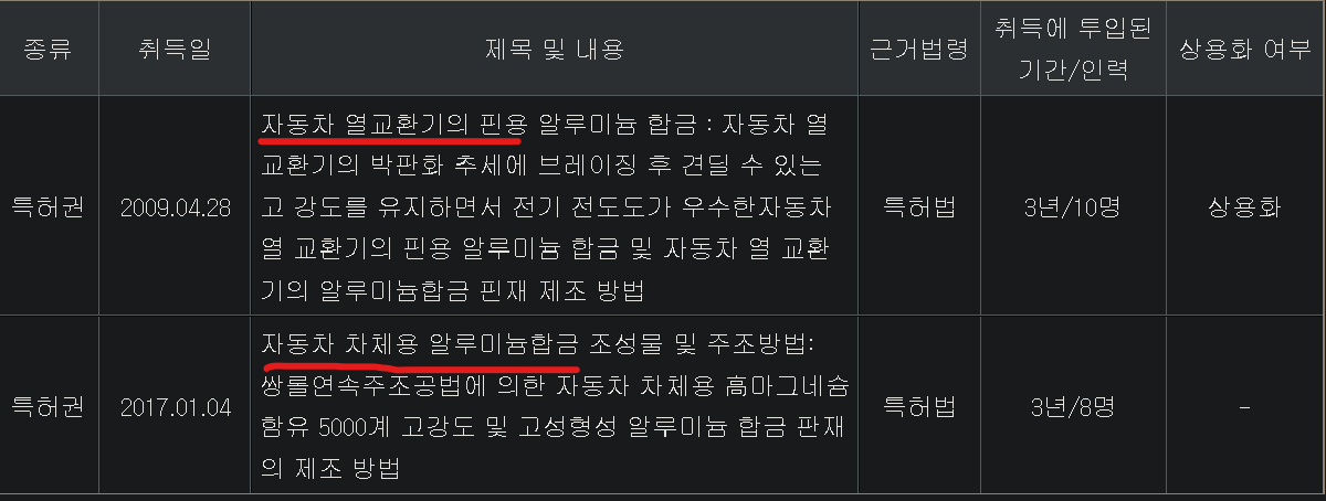 개인적으로 조일알미늄의 연구 및 특허실적을 보면 당사의 현상황과 비전이 보인다는 생각을 하는데요. 조일알미늄의 최근 특허권은 2009년 1건, 2017년 1건 단 2 건정도가 있어요. 내용을 살펴보면, 자동차에 관련한 것이죠. 사실, 조일알미늄이 현재 주목받고 있는 이유는 자동차의 외장재나 열교환기의 알루미늄사용보다는 2차전지에 들어가는 알루미늄박의 원재료인 알루미늄판을 공급하기 때문이죠. 다만, 이는 기술적 난이도가 있는 것 처럼 보이지는 않습니다. 잉곳과 슬래브를 가공하여 알루미늄판으로 만들어 고객사에게 넘기면 되니깐요. 그래서, 추후 중국, 동남아시아 국가들이 진입장벽이 덜한 이곳에 들어와 저가상품으로 알루미늄판을 찍어낸다면, 당사에게는 희소식만은 아닐 것 같다는 생각이 듭니다.