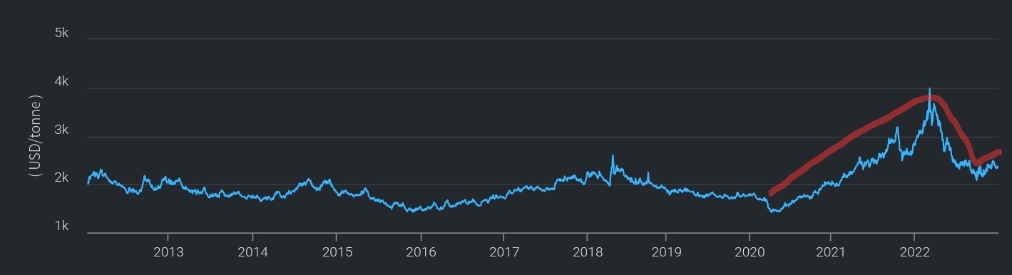 런던금속거래소 기준 알루미늄가격 추이입니다 : 2차전지시장 성장으로 2020년 부터 가격 급등하고 경기침체로 횡보하는 것을 알 수 있어요.