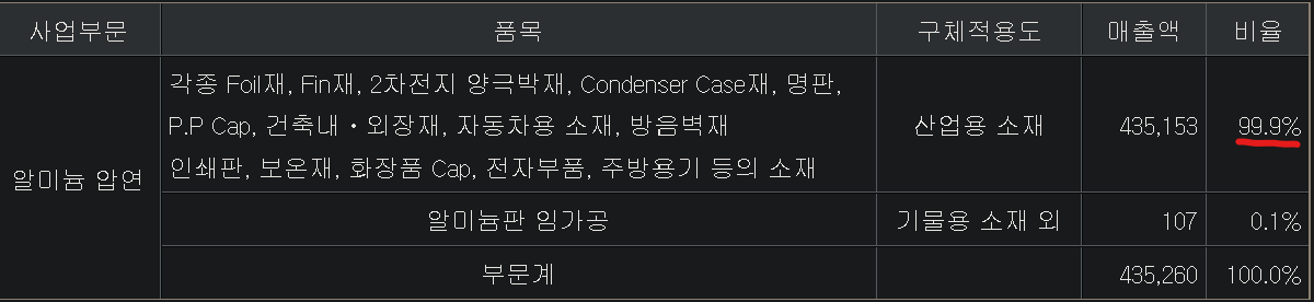알루미늄 압연제품으로 만들어지는 품목들을 조일알미늄이 공시해놨는데요. 주방용기부터 2차전지 양극판까지 다양하게 쓰이는 것을 알 수가 있습니다. 여기서 매출이 99.9% 나오니 조일알미늄은 알루미늄업체라고 할 수 있죠.