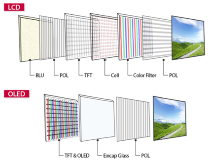 OLED를 다들 들어봤을거에요. OLED는 Organic Light Emitting Diodes의 약자이죠. 말 그대로 빛 을 스스로 내는 발광소자입니다. LCD는 스스로 빛을 내는 소자가 없기 때문에 뒤에 백라이트가 따로 필요한데요. 반대로, OLED는 발광소자가 있기 때문에 백라이트가 필요없죠. 그래서, OLED는 LCD보다 얇은 두께로 양산이 가능한 것이죠.