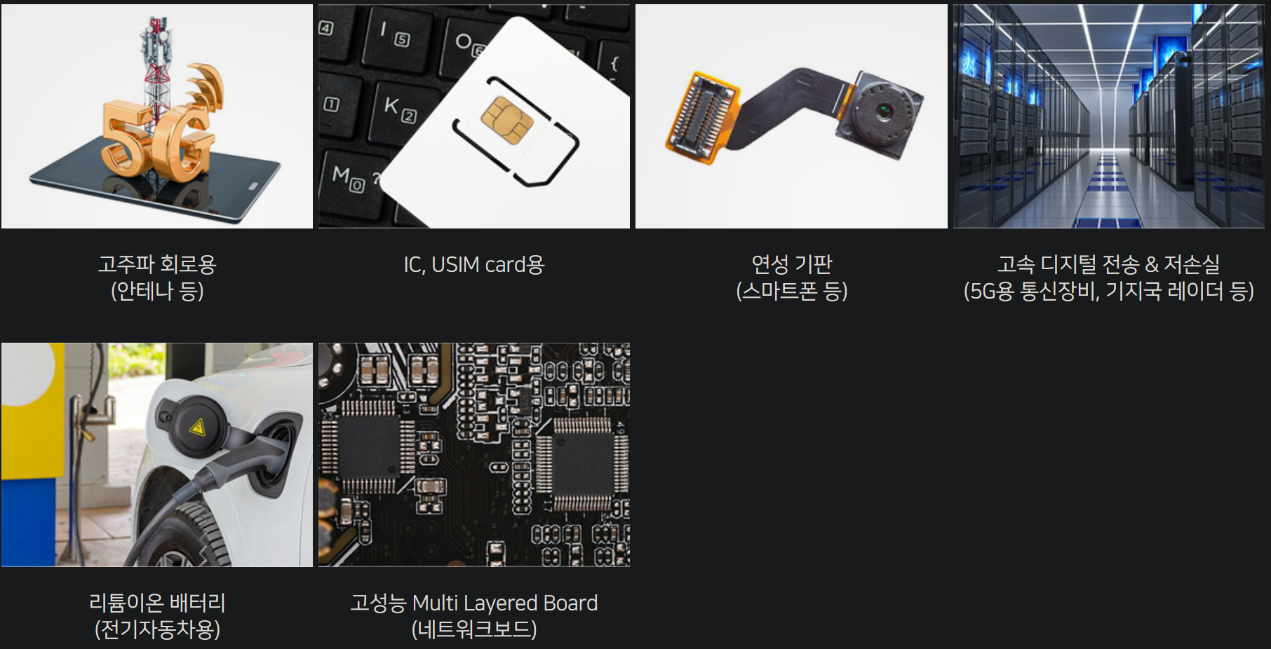 솔루스첨단소재가 만드는 동박은 여러 산업에 적용이 가능합니다. 특히, 앞으로 주목받는 산업 중 5G용 통신장비, 반도체칩도 있고 앞서 설명했던 이차전지배터리에도 들어가죠.
