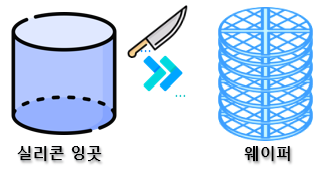 실리콘은 원소기호 Si로 표시되는 규소를 의미하죠. 하나머티리얼즈는 실리콘 잉곳을 생산을 하는데요. 잉곳이란 주형에 제련된 물질을 부어넣어 고체화한 금속덩어리를 뜻해요. 쉽게 말해 규소로 이루어진 원기둥이라 생각하면 됩니다. 이 실리콘 원기둥을 일정 간격으로 자르면 웨이퍼가 되는 것이죠.