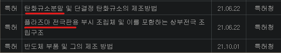 연구실적 뿐만 아니라 특허기록도 봐볼까요. 실리콘카바이드 다른 말이 탄화규소이죠. 이 탄화규소를 정제할 때 분말형식으로 만들어야 제조하기가 편리한데요. 이러한 탄화규소 분말 특허를 취득했고요. 앞서 설명했듯, 식각공정의 플라즈마방식으로도 전자를 유도한 전극판 조립구조에서도 특허를 취득한 것을 알 수 있습니다.