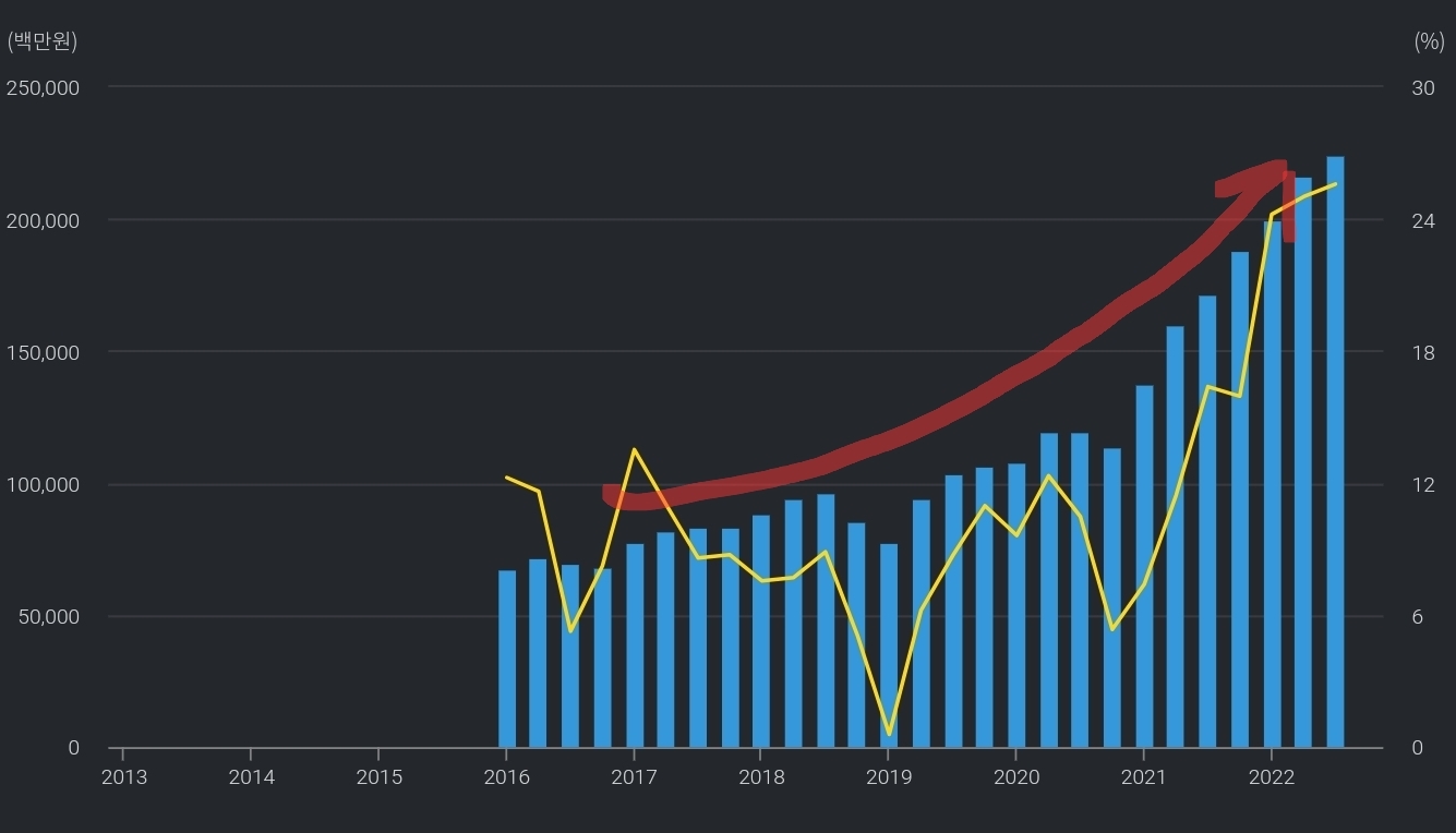 해성디에스의 리드프레임이 특히 전장용으로 많이 들어가고 있는 것이 핵심이에요. 기존 내연기관차에는 반도체가 200개 정도 들어갔다면, 전기차는 500여개 정도 들어간다고 하고요. 자율주행으로 전환이 된다면 800~1000여개의 반도체가 필요하다고 합니다. 칩과 기판을 연결하는 리드프레임의 수요도 당연히 더 증가하겠죠. 아래 표는 실제로 해성디에스의 리드프레임 매출액 성장률을 보여주는 데이터입니다.