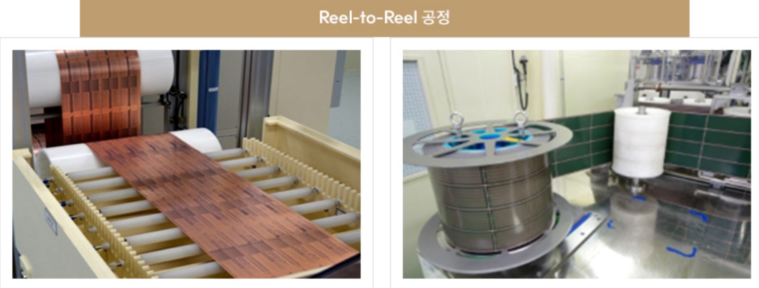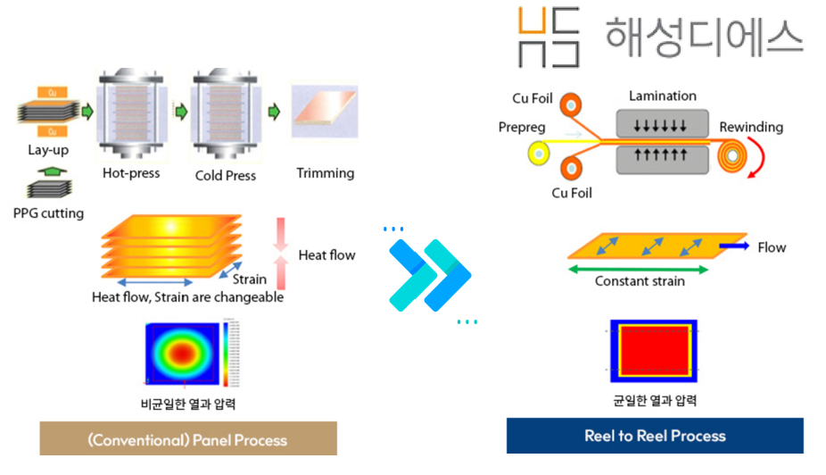 해성디에스의 방식은 구리와 레진을 합쳐 위아래 릴선으로 반죽하듯이 찍어내 기판을 만들어내는 방법입니다. 기존의 것과 가장 큰 특징은 열과 압력이 균일하게 분산되어 좀 더 나은 품질의 패키지기판을 생산할 수 있게 되었다는 것이죠. 거기다가 대량생산까지 가능해졌습니다.