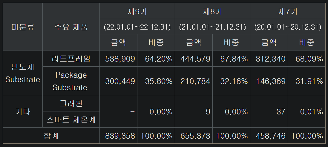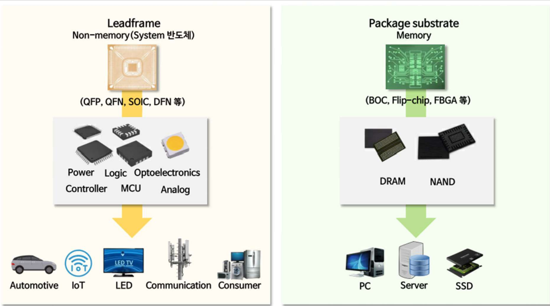 다만, 리드프레임과 패키지기판은 하나의 묶음 상품인 것 같지만 꼭 그렇지만도 않아요. 매출액도 구별해서 공시하고 있죠. 리드프레임은 요즘 전장용(전기차용)으로 가장 많은 수요가 증가하고 있고요. 패키지판은 메모리향 수요로 따로 판매되고 있습니다. 자세한건 아래 설명 해놓을게요.