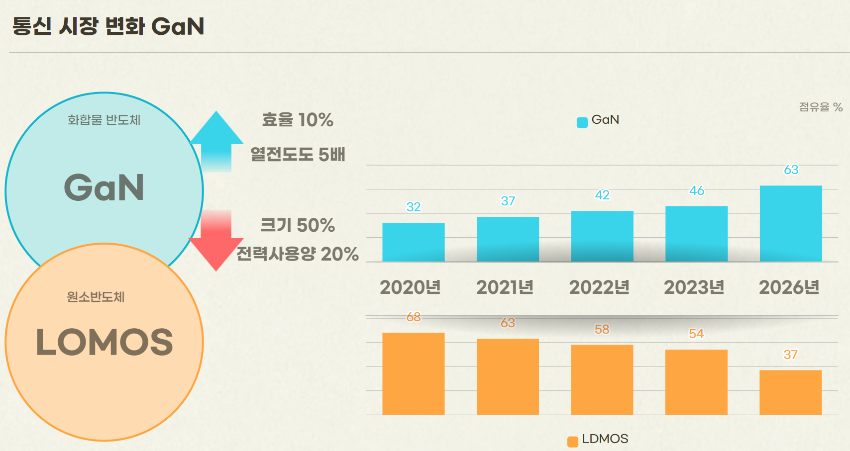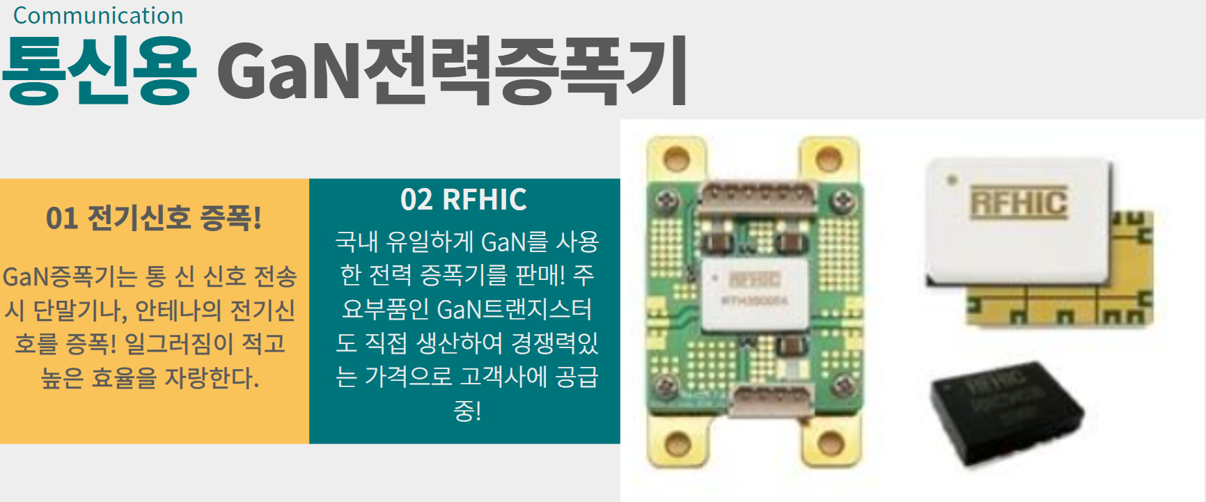 - 통신장비 (GaN 트랜지스터, GaN전력증폭기) 주력96%