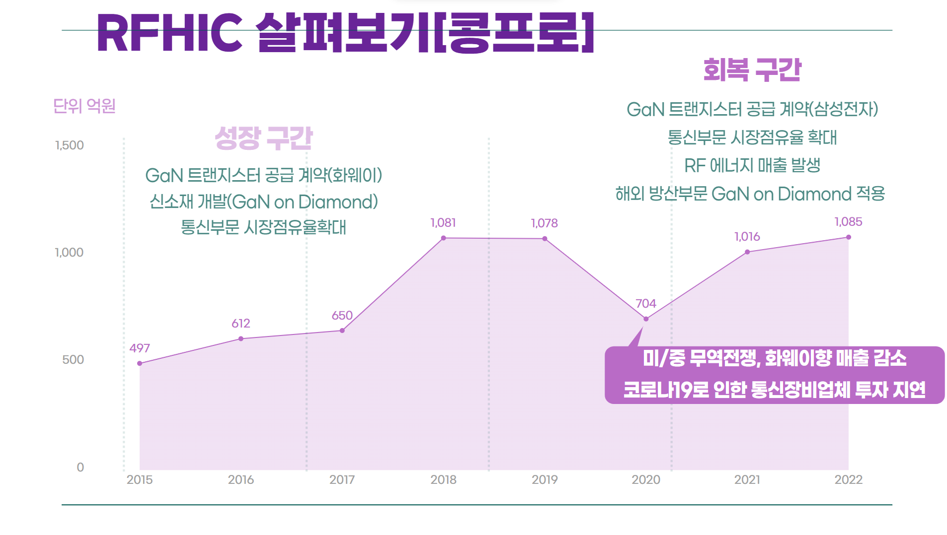 RFHIC는 1999년 창립, 무선통신용반도체기업으로 국내에서 유일하게 GaN(질화갈륨)소재 화합물을 통해 트랜지스터, 전력증폭기를 양산하고 있어요. 통신시장의 경우 30년가까이 LDMOS(Laterally Diffused Metal Oxide Semiconductor)라는 소자를 이용해 왔는데 이 소자가 감당할 수 있는 성능의 한계를 5G가 뛰어넘어 버렸어요.. 즉 기존 LDMOS를 이용한 통신장비들로는 4G대비 고주파수, 데이터 속도, 데이터량, 데이터 수요가 증가한 5G시장을 감당할 수 없게된거죠.. 그래서 GaN소재의 트랜지스터, 전력증폭기의 사용은 이제 선택이 아닌 필수가 되어 버렸구요. RFHIC는 그 기술력을 인정받아 글로벌 통신 장비 기업들과 모두 거래를 하구 있지요~(삼성전자,노키아(NOKIA),에릭슨(ERICSSON),화웨이(HUAWEI))