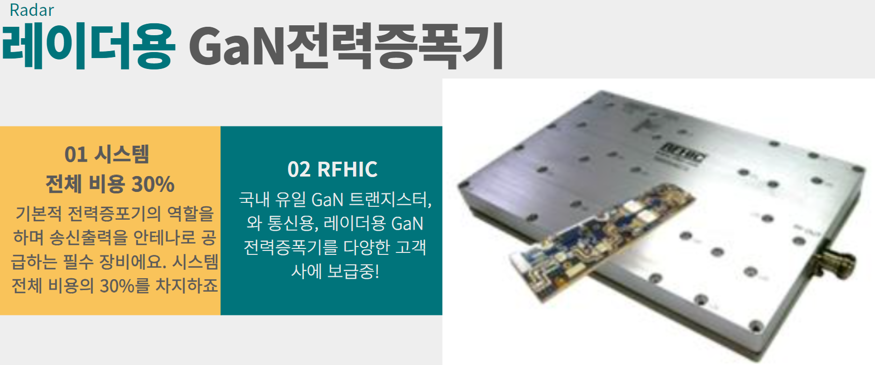 레이더용 GaN전력증폭기는 레이더 시스템의 송수신부 또는 안테나 장치에 장착되서 제어부의 명령을 받아 RF('Radio Frequency' 3KHz~30GHz의 주파수를 갖는 전자기파를 방사하여 정보를 교환하는 통신 방법) 송신출력을 안테나로 공급하는 필수 장비에요. 이 또한 성능개선, 운용 유지비용 절감 및 효율의 극대화를 위해 GaN전력 증폭기의 적용이 증가되고 있는데요. 레이더용 GaN 전력증폭기의 경우 시스템 전체 비용의 30%를 차지하는 고비용, 핵심 요소에요. RFHIC는 통신용, 레이더용 GaN전력증폭기를 다양한 고객사에 공급하고 있답니다~