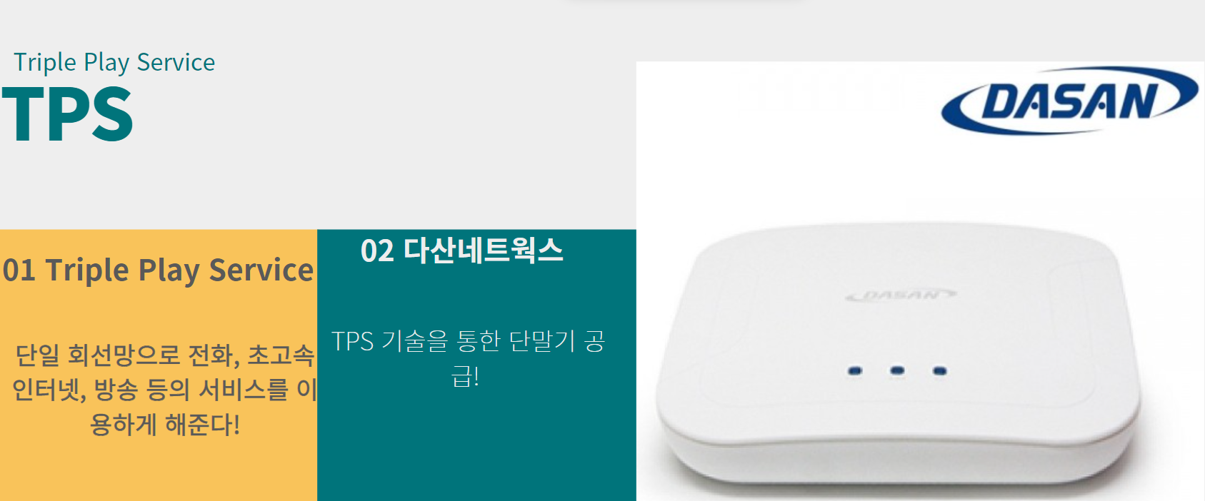 TPS는 "Triple Play Service" 즉 단일 회선망에서 전화, 초고속인터넷, 방송 등의 서비스를 동시에 지원하는 서비스로, 요즘 하나의 단말기로 전화, TV, 인터넷, 다 쓸 수 있죠? 다산네트웍스에서 말하는 TPS는 이 기술을 이용한 단말기를 말하는거에요.