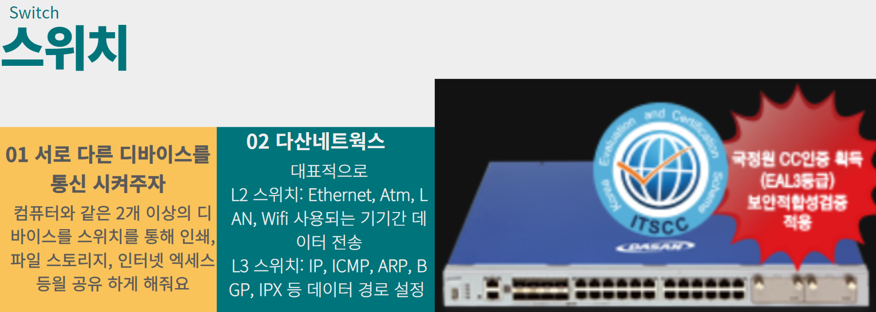 스위치는 네트워크 단위들을 연결하는 통신 장비로, 허브보다 전송 속도가 개선된 것을 말해요. 컴퓨터와 같은 2개 이상의 IT디바이스가 서로 통신하도록 허용하는 장비라고 생각하면 되는데요. 이 스위치를 통해 인쇄, 파일 스토리지, 인터넷 엑세스 등을 공유 하는거죠. 가장 단순한 수준의 스위치는 한 개의 근거리 통신망(LAN)에 있는 디바이스만 연결하구요, 좀더 고급으로 갈 수록 여러 LAN의 디바이스를 연결 할 수있고, 보안 기능까지 갖추며 "가상 네트워크"까지 생성하는데요. 이 유형은 대표적으로 VPN, EVPN-VXLAN등이 있어요.