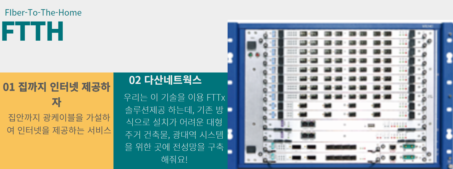 다산네트웍스는 이러한 FTTH기술을 이용하여, FTTx솔루션, 즉 대형 주거 건축물, 소형/중형 주거 건축물, 광대역 시스템을 위한 적용 가능한 전성망을 구축하는 솔루션을 지원하고 있어요!