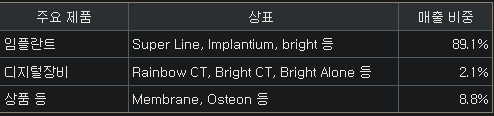 임플란트(89%), 치과용장비(2%, CT), 기타(9%, 합성골, 기자재) / 판매지역 : 중국, 국내, 유럽, 아시아