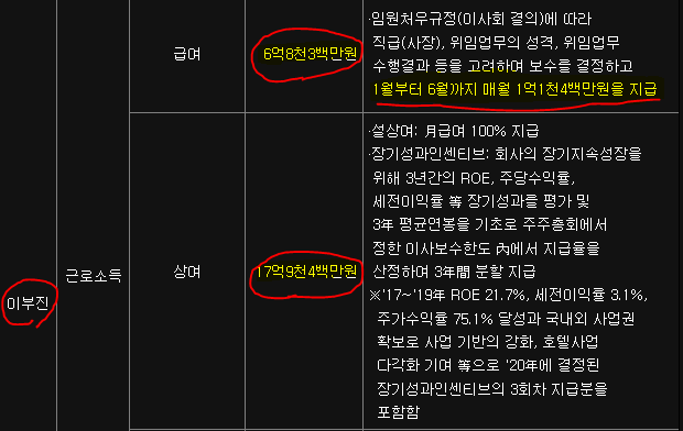이런 와중에 혹시나 임원진은 얼마나 보수를 받고 있나 해서 찾아봤는데 허걱했습니다. 우선, 대표이사 이부진은 매월 1억1천4백만원을 받고요. 상위 1% 부자들의 연봉이 1억 정도 된다던데 그것을 월로 버니 어마무시한 급여액입니다. 여기서 끝이아닙니다. 상여금이라 해서 17억9천4백만원이 측정되었습니다. 성과가를 치하하여 상여금을 주는 것이라 하지만, 회사가 격변의 시기를 겪고 있고 부채가 많은 이 상황에서 주주들의 돈으로 상여금 잔치를 하고 있으면 주주 입장에서는 한숨 나올 수 있단 생각이 듭니다.