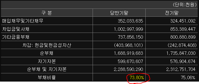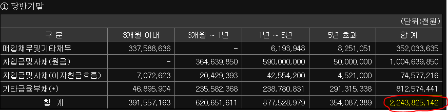 부채도 있겠죠. 현금성 자산이 워낙 많다보니 부채가 많아도 어느 정도 커버 가능하겠지 했지만, 부채 총액이 2조 2천 4백억원 입니다. 발음하기도 힘드네요. 부채 뜯어보며 놀란 것이, 차입금액이 1조 정도 되니 이자비용만 7백4십억 나가는게 충격적이었습니다.
