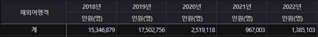 다만, TR부분이 영업손익이 낮은 이유를 추론해보자면, 아직 국내 외국인 방문객의 절대적인 수는 적은 편이다. 18년도만 해도 1500만명수준이었는데, 21년은 96만명. 22년은 아직 10월이지만 2개월밖에 남지않아 많아봤자 2백만명 정도 예상한다.